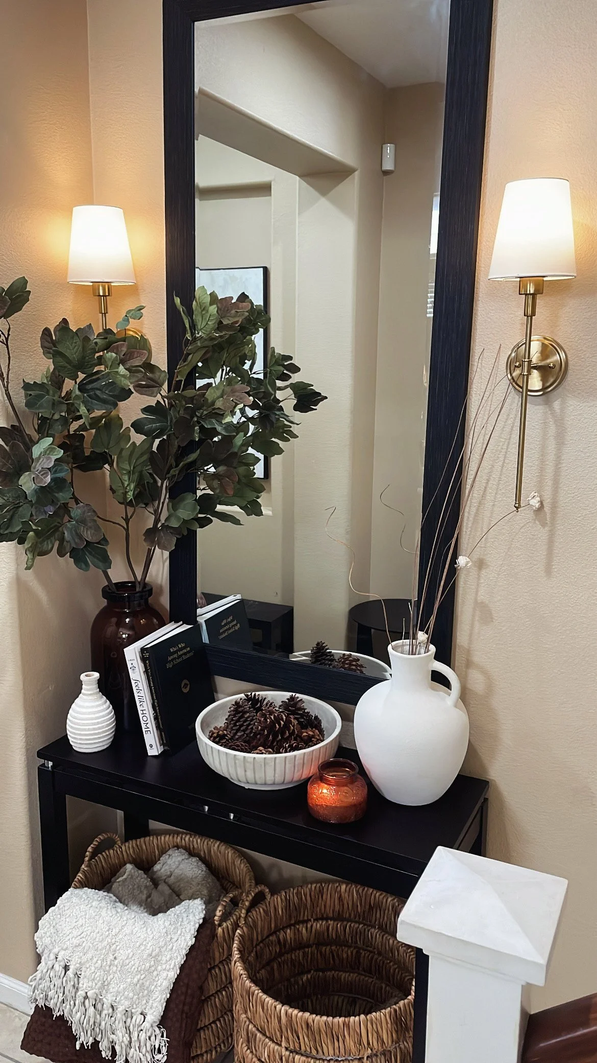Almost everything here is reused — the tall mirror (HomeGoods, 2 years ago), the stone bowl (filled with pinecones I’ve owned for 5 years and refresh with a seasonal spray👇🏾), and layered blankets from my fall bin. The only new pieces are a bundle of Pottery Barn stems, which balance the green outdoors that stays year-round where we live, and these gorgeous rechargeable wall sconces from Amazon!