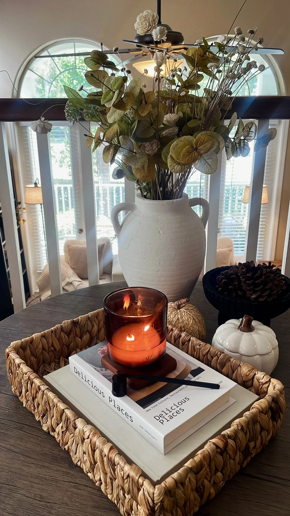 For me, neutral tones have been the easiest way to transition between seasons without spending a fortune. Then I decide which spaces deserve a seasonal shift — this year it’s the front door, the entryway, a cozy tabletop, plus a few swaps in linens, lighting, and fragrance throughout the house.