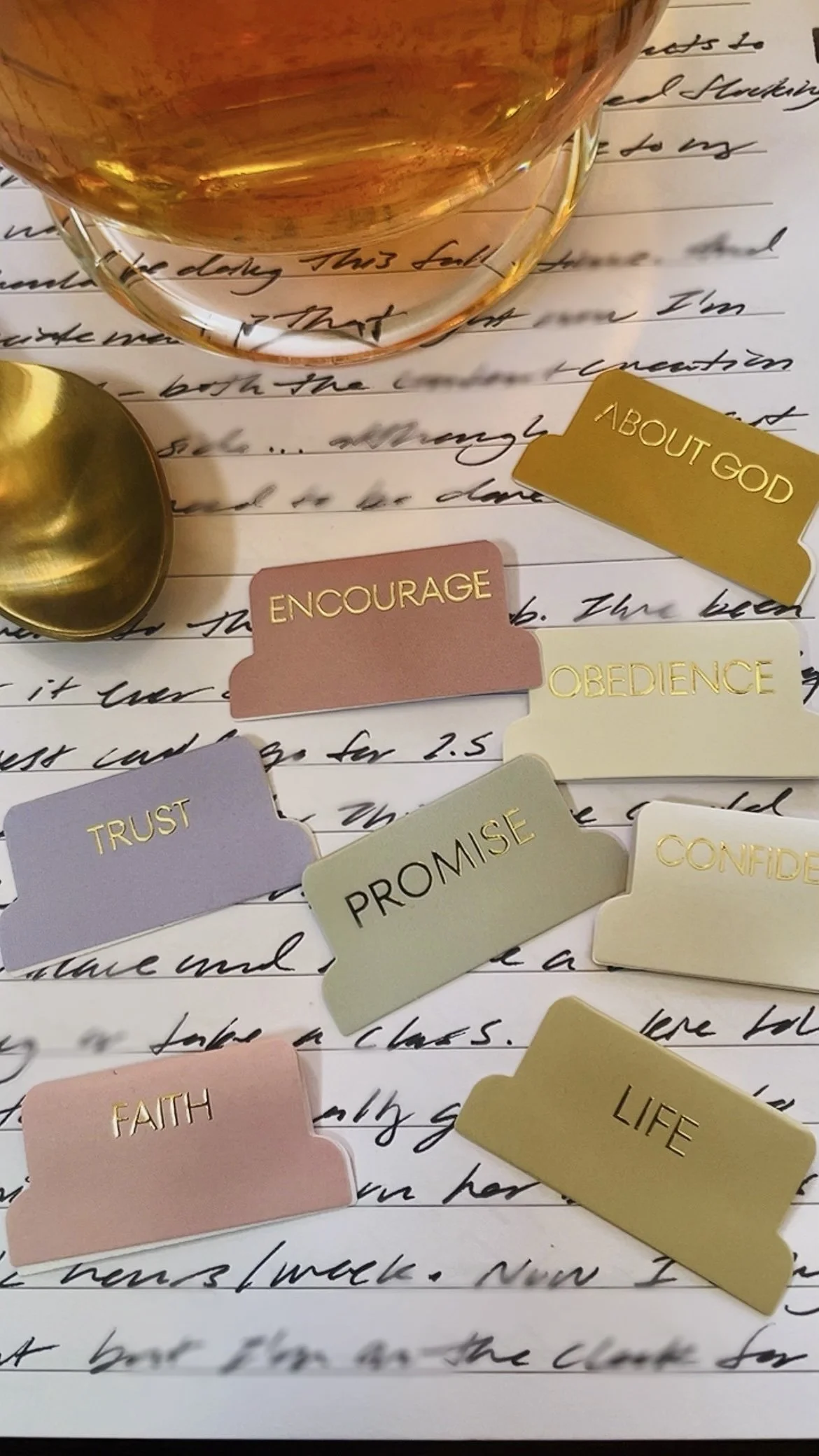 These tabs are stunning and the packet comes with 24 different topics like: courage, faith, wisdom, fear, confidence, etc. Serious journalers, you need these!! Take a closer look here to see if the recurring themes in your journal are included.